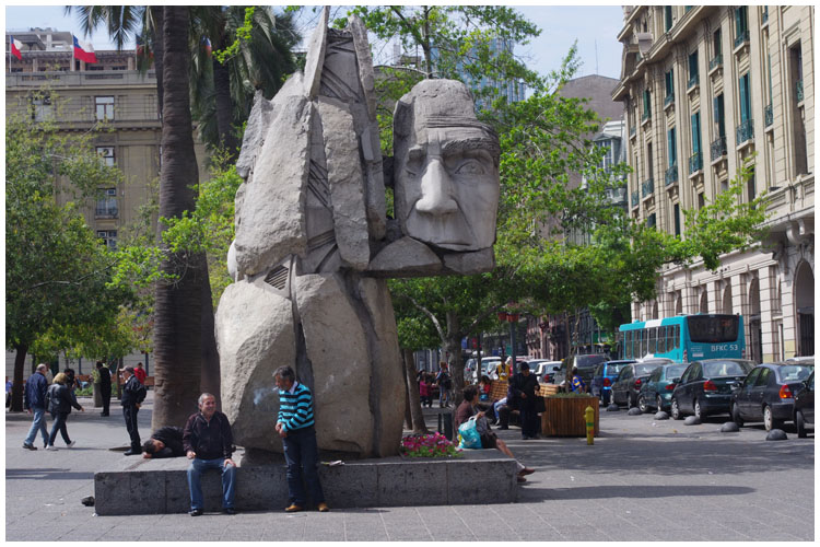 Die Skulptur auf die indianischen Völker Chiles gehört ebenso wie ein Reiterstandbild von Pedro de Valdivia zu den Klassikern auf dem alten "Waffenplatz" der Hauptstadt.