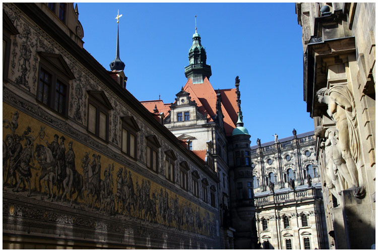 Die Ahnengalerie der zwischen 1127 und 1904 aus dem Hause Wettin stammenden Markgrafen, Fürsten und Königen ist auf etwa 23.000 Meißnischen Fliesen aufgetragen.