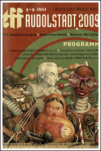 Roots und Folk und World Music in Rudolstadt. Ungeschminkt, mit wachsender Teilnahme und vertraut detaillierter Vorbereitung. Während die jährliche Kultveranstaltung seine trauten Klänge durch das Saaletal verlauten lässt, wird das Wetter auch von Jahr zu Jahr besser. 2009 stand im Zeichen von Russland, Magic Lute was auch immer das zu Beginn sein mochte, und Schiller. Die „heimliche Geliebte“ (Rudolstadt’s Slogan) des Dichters hatte sich wieder für den friedlichen Ansturm der Festivalbegeisterten herausgeputzt, war in Tanzlaune und tiefenentspannt.