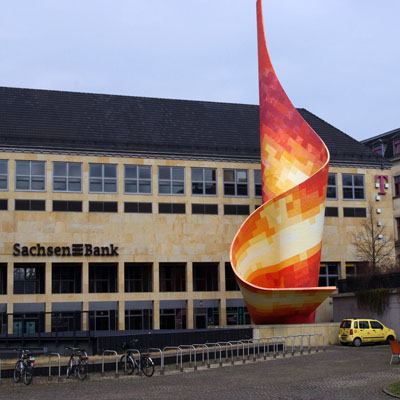 Das 1967 errichtete, ehemals rote Fahnenmonument sollte als "Flamme der Revolution" an die russische Oktoberrevolution erinnern, war zentraler Aufmarschort zu DDR-Zeiten und wurde nach der Wende nicht abgerissen, sondern nur farbig umgestaltet.