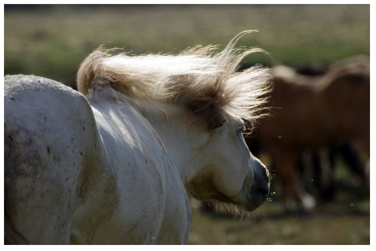 "Eine Herde Islandpferde graste am Bach und ließ sich im langsam untergehenden Sonnenlicht nicht von Wind und Mücken stören."