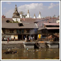 Der nächste Tag stand im Zeichen von Shiva, Buddha und dem Trekkingparadis Kathmandu. Nach den Unruhen der letzten Jahre trafen wir in Pashupatinath zuerst auf die unsäglich aufdringlichen Möchtegern-Guides und Antiquitätenverkäufer. Pashupatinath ist eine der wichtigsten Tempelstätten des Hinduismus. Hier wird Shiva, die mächtige Gottheit der Zerstörung, als Pashupati (Herr der Tiere) verehrt. Die Tempelanlage liegt am heiligen Fluss Bagmati. Den eigentlichen Tempel, nur für Hindus zugänglich, war für uns gesperrt, doch konnten wir einen Blick in den vorderen Tempelbezirk werfen. Doch bevor wir auf diese Seite des Bagmati gingen, wurden wir von der hiesigen Seite des Flusses Zeugen einer der „letzten Riten“ vieler gläubiger Hindus. Der Bagmati teilt die Anlage in zwei große Bereiche. Am linken Ufer des Bagmati liegen der Pashupatinath-Tempel und die Verbrennungsstätten, die Arya Ghats (Verbrennungsstätten der höheren Kasten) und die Surya Ghats (Verbrennungsstätten der niederen Kasten). Als „letzter Ritus“ gilt es als erstrebenswert, seine Leiche hier verbrennen zu lassen. Bereits auf dem Weg zu den Verbrennungsstätten bemerkte ich die qualmenden Scheiterhaufen am Ufer. Der heilige Fluss war vollkommen verdreckt und die verkohlten Überreste der Feuer lagen im Wasser verstreut. Kinder suchten im trüben Wasser nach Wertvollem, fischten die von Pilgern in den Fluss geworfenen Münzen mit selbstgebauten Netzen und Magneten wieder heraus. Einige hundert Meter unterhalb der Scheiterhaufen wuschen Frauen ihre Wäsche in dem heiligen Nass. Die Sonne strahlte bereits wieder unerbittlich auf uns herab. Wir nahmen gegenüber Arya Ghat, dem Verbrennungsplatz der Mitglieder der königlichen Familie Platz und verfolgten die Zeremonie. Die in gelbe Tücher gehüllte Leiche wurde zum vorbereiteten Scheiterhaufen getragen. Bereits kurz zuvor wurden ihr die Füße im heiligen Bagmati gewaschen. Der eigentlichen Verbrennung dürfen nur die männlichen Angehörigen beiwohnen; die Frauen stehen klagend abseits. Während der Vorbereitungen, die sich ewig hinzuziehen schien, jagten einige junge Halbstarke eine ältere Frau am Ufer entlang. Die Alte war offensichtlich geistig verwirrt, beschrie und beschimpfte die Jungen, das es laut von den Tempelanlagen und Altären widerhallte. Doch der Übermut und die Reaktion der Frau ließen die Jungs nur weiter rufen und die Alte mit Nüssen beschmeißen, die sie kurz zuvor aus dem Fluss geangelt hatten. Ich setzte mich auf die kühlen Stufen des Shivatempels in den Schatten, während die Leiche auf den Scheiterhaufen gehoben wurde und ein Mann, der Tradition nach, der älteste Sohn, den Scheiterhaufen fünfmal im Uhrzeigersinn umschritt. Danach zündete ein Priester mit Strohbüschen den Scheiterhaufen an, das er dazu in den Mund des Toten steckte. Feuchtes Stroh sorgte für heftigen Qualm und Timo für unerschöpfliche Erklärungen. Ich schaltete nur noch ab.