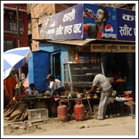 Wie in den vielen Grenzstädten dieser Welt konnten wir auch bereits hier unsere letzten chinesischen Yuan gegen nepalesische Rupien eintauschen, wofür eine ganze Gruppe an sich gegenseitig überbietenden Frauen stand. Am Morgen hatten wir wieder Stromausfall, was für die Grenzgebiete in diesem Teil Tibets nichts ungewöhnliches ist. Der Grenzübertritt zog sich in die Länge. Wir hörten, dass die Server ausgefallen sein sollten. Nepal lag auf der anderen Seite der Schlucht; keine hundert Meter entfernt. Dreckig und eng krallten sich die Häuser beiderseits der Schlucht an die Hänge. Unterhalb der Häuser lagen unbeschreibliche Müllberge, deren Ausläufer bis an den klaren Gebirgsfluss reichten. Die Chinesen kontrollierten, im Gegensatz zur Einreise, sehr intensiv unsere Gepäckstücke; blätterten die Bücher nach den verbotenen Bildern des Dalai Lama durch und inspizierten die Gebetsmühlen und Wanderschuhe. Nepal empfing uns mit weiterem Lärm. Inzwischen war es Mittag geworden und die Sonne hatte sich mit ihrer ersten Wärme in die Schlucht verirrt. In einer schmucklosen Betonbaracke erhielten wir unsere Einreisestempel. Eingeklemmt zwischen hohen Bergen, aufkommender, drückender Schwüle und umringt von streunenden Hunden, warteten wir im Nirgendwo. Der Bus, der uns nach Kathmandu bringen sollte, war nicht vor Ort und keine Besserung in Sicht. In diesen Momenten bewährte sich unsere asiatische Kaltschnäuzigkeit. Timo, der alle Reisedaten hatte, rief bei seiner nepalesischen Kontaktperson an und forderte umgehenden Ersatz, andernfalls würden wir einfach einen der hier wartenden Busse okkupieren. Innerhalb einer halben Stunde hatten wir unseren Bus, der von zwei jungen, etwa 18jährigen Nepalesen in rasanter Fahrt nach Kathmandu überführt wurde.
