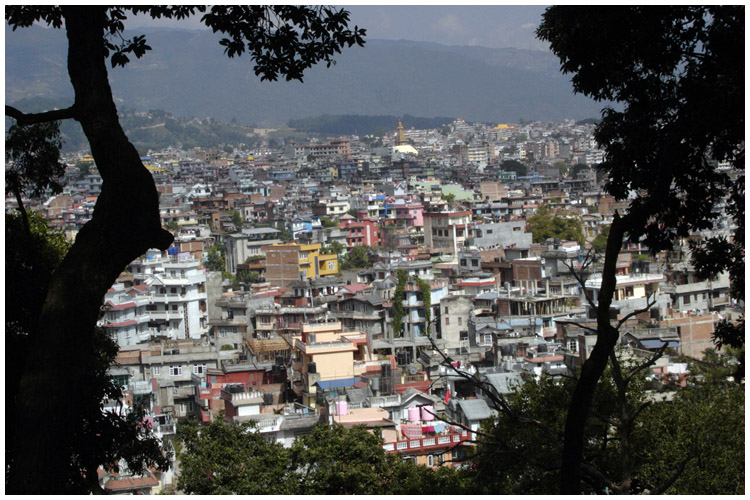 Vom Mrigasthali-Hügel, in dem sich der Legende nach Shiva mit Parvati in Gazellengestalt vergnügt habe sollte leuchtet von weitem die Stupa von Bodnath, dem buddhistischen Heiligtum in Nepal.
