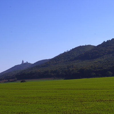Graziel erstrecken sich die Ausläufer des schmalen Gebirgszuges in die fruchtbare Ebene der Goldenen Aue. Weithin sichtbar präsentieren sich auf dem Kamm die alte Reichsburg und das Kaiser-Wilhelm-Denkmal, Burgruine Rothenburg und Fernsehturm (v.l.).