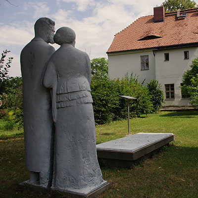 Die Skulpturengruppe auf dem Röckener Friedhof zeigt Nietzsche in verschiedenen Lebenssituationen stehend an seinem Grab und mit seiner Mutter.