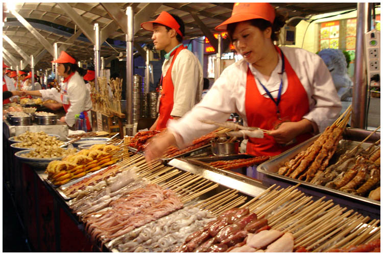 "Neben den originalen Cartier, Rolex und Gucci standen auch Starbucks und Nike offen. Straßenhändler boten gegenüber von MacDonalds gegrillte Seepferdchen, Tintenfische und Skorpione an."