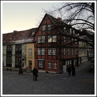"Es gibt einen Ort im Königreich der Sachsen mit Namen Quedlinburg, berühmt und erhaben durch die Ehre, ein Königssitz zu sein." Durch die schmalen Gassen weht kühler Wind und in den Fensterscheiben spiegeln sich fahle Sonnenstrahlen. Die Winterkälte nistet in den Häuserecken und im jahrhundertealten Fachwerk und treibt die wenigen Touristen in die Gaststuben. Am Finkenherd unterhalb des gewaltigen Kirchen- und Schloßensembles, wo der Legende nach dem Sachsen Heinrich 919 auf der Vogeljagd von einem Boten die Nachricht von seiner Wahl zum deutschen König überbracht worden sein soll, wechseln Cafes und Nippesläden im mittelalterlichen Fachwerkdesign einander ab. "Gleicher unter Gleichen"; Heinrich, der auch den Beinamen "der Vogler" erhielt, bewies politischen Spürsinn und vermied es in den frühmittelalterlichen Machtspielen seinen Führungsanspruch herauszustreichen. Auch der Finkenherd teilt seine Legende mit anderen Orten.