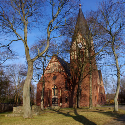 An der Stelle der heutigen neogotischen Kirche stand bis 1902 eine romanische Feldsteinkirche. Bei ihrem Abriss, der aus bautechnischen Gründen nötig war, entdeckte man einen Figurengrabstein.