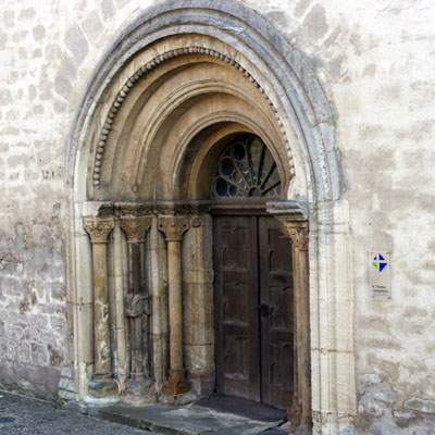 „Der Bau der Neumarktkirche Merseburg ist weitestgehend original erhalten. Die Thomas Becket von Canterbury geweihte Kirche war ursprünglich eine dreischiffige, kreuzförmige Basilika mit westlicher Doppelturmfront. Die Neumarktkirche St. Thomas Cantuariensis wurde 1188 erstmals in einer Urkunde von Kaiser Friedrich Barbarossa erwähnt. … Zeitweilig war in der Neumarktkirche ein Benediktinerinnenkonvent angesiedelt. 1825/26 wurde sie umfassend restauriert. Die mittelalterliche Sakristei wurde abgerissen. Erhalten blieb bis heute die im mitteldeutschen Raum einzigartige Knotensäule am spätromanischen Hauptportal. 1991-95 erfolgte dann die umfassende Sanierung und erneute Weihe der Kirche, der Fußboden wurde wieder auf das ursprüngliche Niveau abgesenkt. Die romanische Grundstruktur und Bauornamentik blieb erhalten.“