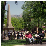 Santa Fe war letztlich wirklich nicht eine dieser typischen amerikanischen Städte. Der Ort passte sich der sanften Hügellandschaft an. Die zahllosen Adobe-Einfamilienhäuser duckten sich zwischen Büschen, Yukapalmen, dem hier noch schmalen Rio Grande und der Sangre de Cristo Range. Kein Wolkenkratzer verschandelte die Landschaft und wies den Weg nach Downtown. So benötigte ich etwas mehr als eine Stunde, verfuhr mich mehrmals und mindestens der mal dieselbe Strasse auf und ab, bis ich in der E Water Street einen Parkplatz fand. Santa Fe erinnerte mich an die kleine Spielzeuglokomotive, mit der ich als Zehnjähriger durch das Wohnzimmer fuhr und stets die Indianer gewinnen lies. Ishta’s Treasures war eine der vielen kleinen Künstlerläden, die den typischen Silber- und Türkisschmuck anbot. Die alte Dame erinnerte mich in ihrer Lederkluft an eine Altachtundsechzigerin und entpuppte sich wahrhaftig als Österreicherin mit schlechtem Akzent. Am alten Gouverneurspalast boten Indianer immer noch ihre selbst gefertigten Schmuckstücke feil und wenige Meter weiter sorgten Steak- und Hotdogbuden für eine kalorienhaltige Nahrungsgrundlage. Ich nutzte die letzten Stunden des Tages und fuhr weiter in Richtung Los Alamos.