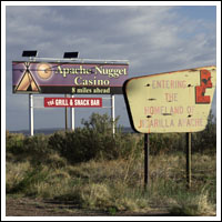 In den folgenden Tagen fuhr ich über furchtbar lange und einsame Straßen und über teils zerrüttete Schotterpisten. Vereinzelte Blockhütten, Wohntrailer und kleine Ansiedlungen dösten am Wege dahin. Einige Pferde grasten zwischen den zahllosen, winterharten Beifußbüschen, die hier „sagebrush“ genannt werden und sich endlos bis zum Horizont hinziehen. Zerschossene Verkehrsschilder wiesen darauf hin, dass Fahren unter Alkoholeinfluss verboten ist und ein zerschlissenes Werbeplakat markierte den Beginn der Jicarilla-Apachen Reservation und das nahegelegene Spielkasino. Counselors, Lybrook und Blanco Trading Post waren jene typischen Nester, in denen man seinen Stiefel nicht verlieren möchte und hofft, das der Sprit bis zur nächsten Tankstelle reicht.