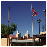 Für mich blieb Albuqerque nur erste Rast. Ich war nach dem langen Flug übermüdet, hungrig und nicht mehr in der Stimmung, meinen Beinen im kühlen Nass des Rio Grande etwas Erholung zu gönnen. Die Sonne verschwand ziemlich zügig, mein Motelzimmer, welches ich mir von Deutschland aus bereits reserviert hatte, war klimatisiert und im mexikanischen Stil hergerichtet. Nachdem ich geduscht hatte, schloss ich meinen ersten amerikanischen Abend mit einem kühlen Bier und hausgemachten Tapas inklusive grünem Chili ab. Albuquerque schien sich seit den Zeiten des Balduin Möllhausen nicht sehr geändert zu haben. Old town lag am folgenden Morgen einsam und träge im Sonnenlicht. Nur einige Kirchgänger liefen über die kleine Don Luis Plaza zum Gotteshaus hinüber. Auf Schnüre gezogenen Chilischoten baumelten lustlos zwischen Andenkenläden und Galerien. Aus einem Fenster griente mir la Catrina, die mexikanische Skelett-Dame, entgegen und bewies den langen Einfluss des südlichen Nachbarn. „Homeland-Security since 1492“ verkündete dagegen ein Aufkleber mit dem Konterfei des Apachen Geronimo und verwies auf die blutige Geschichte der Indianer.