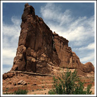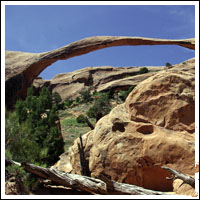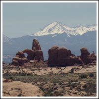 Moab ist ein kleiner quirliger Ort südlich des Colorado Rivers und Ausgangspunkt der meisten Safaris, Raftingtouren und zum Arches Nationalpark, Canyonland Nationalpark und Death Horse Point State Park. Ich fand im Bowen Motel eine angenehme Übernachtung. Das, für amerikanische Verhältnisse eher ungewöhnliche Frühstück, bestand aus einigen Donuts, Toastscheiben, Kaffee in Styroporbechern und einem Apfel. Eine Stichstraße führte nördlich von Moab in den Arches Nationalpark. Ich fuhr an den Three Gossips, Sheep Rock, Tower of Babel und der Great Wall etwa zehn Meilen bis zum Balanced Rock, der mit akrobatischem Engagement Wind und Wetter trotzte. An der Wolfe Ranch ließ ich meinen Jeep auf dem kleinen Parkplatz stehen, schulterte Kamera und genügend Wasser und machte mich eine Stunde hinauf zum Delicate Arch. Die Sonne stand glücklicherweise noch nicht sehr hoch und die Temperaturen waren noch bekömmlich. Stunden später sollten mir in der Mittagshitze und auf dem Rückweg einige offensichtlich knie- und hüftkranke Amerikaner mit hochrotem Gesicht wie gestörte Yuppies mit Kleinkindern. Doch vorerst nutzte ich meine Energie, um zum Wahrzeichen Utahs zu kommen. Der Weg ist nicht sehr mühsam, geht streckenweise steil bergauf und über mächtige Felsplatten. Vierzehn beeindruckende Meter steht der Felsbogen für die Künstler und Touristen, Neugierigen und zahllosen Fotoapparate Motiv. Im Hintergrund hebt sich das Uncompahgre Plateau mit seinen 3.000 Meter hohen Bergspitzen gegen den Horizont ab und zu Füßen des Bogens liegt ein von Spiralen durchzogener Talkessel. Der Park ist ideal für Biker und Trekker; die Natur als Fotomodel atemberaubend. Im Devils Garden schleppen sich etliche Japaner schwitzend und schwatzend zum Landscape Arch. Nur wenige wandern in der Hitze weiter zum Double O Arch oder zum Dark Angel.