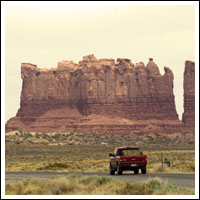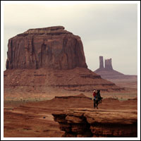 Die Landschaft war staubig, windig und faszinierend. Der Inbegriff des amerikanischen Westens wurde 1959 von den Navajos zum Park erklärt, um die majestätische Natur zu schützen. Im Besucherzentrum von Tse’Bii’Ndzisgaii, wie das Tal von den Indianern genannt wird, dokumentierte eine kleine Ausstellung das Leben der Navajos und Hopis, deren Reservat das größte zusammenhängende in den Vereinigten Staaten ist. John Wayne, der hier mit John Ford seine ersten Filme drehte, ritt im Souvenirshop auf Handtüchern, Plakaten und Kaffeetassen neben Dreamchatchern und Cowboyhüten „Made in China“. Ein etwa 17 Meilen langer Rundkurs führte auf einer mit mächtigen Schlaglöchern gesegneten Staubpiste durch das Tal über die sich neben Jeeps und Pickups auch einige wagemutige Wohnmobile quälten. Die mächtigen Felstürme, durch Wind- und Regenerosion geschaffen, reckten sich wie Überbleibsel einer vergangenen Epoche gegen den Himmel. Feiner, roter, mehlartiger Sand wurde immer wieder von heftigen Windrosen aufgewirbelt. Elefantenberg und Marterpfahl, Sandbach und Radnabe. Die Navajos hatten jedem der Urgewalten einen Namen gegeben. Am John Ford Point trafen sich die meisten Touristen, die den Weg ins Tal hinein gewagt hatten. Ein junger Indianer saß mit seinem Pferd für Fotos Model und ließ den Hengst immer mal wieder marketingmäßig steigen. Indianerinnen verkauften den traditionellen wie bekannten Silberschmuck mit blauen Türkiseinsätzen an Japaner, Franzosen und Deutsche. Weit hinten im Tal duckten sich einzelne Wohntrailer und Blockhütten gegen die Felswände und boten den Indianern Heimat. Um sich dem Gefühl von Marlboro-Freiheit und „Spiel mir das Lied vom Tod“ ganz hingeben zu können, boten die geschäftstüchtigen Navajos auch Reittouren durchs Gelände an. Am „Nordfenster“ trommelten zwei dicke Navajos für eine Schar japanischer Touristen einige Indianerrythmen und ließen sich dabei ausgiebig fotografieren. Kayenta war für mich die letzte Station, bevor ich mich über den Highway 160 weiter in Richtung Westen fuhr. In der kleinen Stadt leben fast 5.000 Indianer; die Retortenwohnungen reihen sich aneinander, eine Tankstelle und ein Store, MacDonalds und drei Motels vervollständigen das Nest, welches jährliche Rodeos veranstaltet. Die Indianer lassen sich hier nicht lumpen, haben die frühen Geldüberfälle umgedreht und verlangen für eine Übernachtung schlappe 180 Dollar.