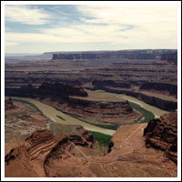 Später machte ich noch einen Abstecher hinauf zum Death Horse Point. Wie eine mächtige Aussichtskanzel hebt sich das Plateau hier 1.830 Meter hoch über den zerrissenen und zerfurchten Canyonrändern, durch die der Colorado River mächtige Bögen beschreibt. Es sind die letzten Ausläufer des Canyonland Nationalparks, den ich jedoch links liegen lies. Der Highway 191 trifft etwas nördlich auf den Interstate 70, der von Denver kommt. Westlich liegt das Kaff Green River, wo endlos scheinende Straßenarbeiten den Verkehr unterbrachen und der Wind tröge durch die Straßen strich. Ich kam beim Tanken immer noch nicht mit dem amerikanischen System zurecht. An manchen Tankstellen sollte ich meine gewünschte Gallonenzahl angeben, an manchen erst die Kreditkarte hinterlegen und an anderen wieder ging beides in Kombination. Es hatte für mich etwas von den drei Stooges, etwas Schildbürgerhaftes und blieb mir doch als Running Gag haften.