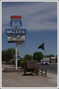 Während am folgenden Morgen die ersten Mulis mit ihren Touristen über den Bright Angel Trailhead zum Grund des Canyons aufbrachen, stattete ich der „Motherroad“, der Straße aller Straßen“, der Route 66, einen Besuch ab. Nicht das manche Straßen, über ich bis dahin gefahren war, nicht auch eine Route 66 hätten sein können. Einsam gelegen, nur von dürren Gestrüpp und spärlichem Verkehr frequentiert, führten auch diese Straßen in Richtung Westen. Doch der Mythos der Strecke Chicago Los Angeles war nicht zu brechen. Wenn er während der großen Depression zum Hoffnungsträger einer verlassenen Generation wurde, so mutierte er dank Easy Rider zum Freiheitsmythos. „Get your kicks on Route 66“. Der Mythos wurde seit den 1950er Jahre unter vier- und sechsspurigen Interstates und Highways begraben. Doch Seligman war das Nest, das sich den Mythos bis heute bewahrt hatte. Andere Ortschaften waren nur zum Tanken gut und lockten nicht mit einem Aufenthalt. Doch Seligman hatte ausrangierte Chevrolets und Cadillacs, alte Straßenschilder und Motels, die den Mythos aufrecht hielten. Im Barbershop hing neben unzähligen Nummernschildern aus Illinois, Minnesota, Havelland und Sangerhausen auch ein Wimpel des FC Dynamo Dresden. Ich machte eine Rast in Lilo’s Cafe, die die deutsche Bar an ihre Enkelin weitervererbt hatte. „Stammtisch“ grinste mir vom Nachbartisch gemütlich deutsch entgegen. Vor dem Cafe parkten ein paar ältere Motorradfahrer ihre schweren Harleys und tauschten sich in schwäbischem Dialekt über die letzten Erlebnisse aus.