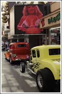 Ich gönnte mir in der Nacht trotz wundgelaufener Füße noch einen Ausflug auf den Stratosphere Tower, der mir dies mit einem herrlichen Ausblick auf das hell leuchtende Vegas belohnte. Am nächsten Morgen, einem Sonntag, fuhr ich noch hinunter in die Fremont Street, Downtown. Während sich einige Penner in den Seitenstraßen tummelten, verhaftete ein Polizist in der Nähe des El Cortez Hotel eine Schwarze. In der, aus Gründen des Denkmalschutzes mittlerweile überdachten Freemont Street trafen sich früher Spieler, Showgirls und die Mafia. Die Automobilverliebten Amerikaner stellte an jenem Sonntag ihre liebevoll restaurierten Oldtimer zur Schau. Buick, Mustang und Chevrolet glänzten zufrieden neben aufgemotzten VW-Käfer und Spitfire. Betty Bu und Elvis lagen vertraut als Aschenbecher, Haftmagnete und Untersetzer in den Regalen und für mich wurde es Zeit, nach Kalifornien zu fahren.