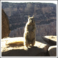 Ich folgte der schmalen Straße, die sich südlich der zerrissenen Canyonflanke bis zum Grand Canyon Village zog. Wie an einer Perlenkette reihten sich die Aussichtspunkte Navajo Point, Lipan Point, Papago Point, Moran Point und unzählige weitere aneinander. Einige waren mit dem Jeep zu erreichen, andere einen kurzen Fußmarsch notwendig. Lohnenswert waren sie alle. Glücklicherweise waren die jährlich fünf Millionen Besucher an jenen Tagen nicht zu spüren. Einige Rehe und Hirsche grasten zutraulich am Straßenrand und hoben manchmal bettelnd und neugierig ihre Häupter. Für meinen Zeltplatz musste ich fast zwei Stunden in brütender Hitze anstehen und kam mir vor wie in einer VW-Kantine, wenn es Currywurst gibt. Doch hatte ich nun genügend Zeit, mir das Dorf anzusehen, welches zwischen Ponderosakiefern und Wacholderbüschen direkt am Canyonrand liegt. Das Geschäft mit den Touristen begann mit der Ankunft der ersten Eisenbahn im September 1901. Die Bright Angel Lodge existierte bereits damals und das luxuriöse El Tovar öffnete 1905 seine Pforten. Da die Parkverwaltung der anhaltenden Blechlawinen heute nur schwer Herr wird, wurde die 1968 geschlossene Bahnlinie 1989 mit historischen Loks wieder aufgenommen; manche Strecken sind für den Autoverkehr gesperrt und werden mit Hybridbussen bedient. Ich genoss den Sonnenuntergang, der lange Zeit sein warmes Licht über die Felshänge und Schluchten goss. Ein kleines Eichhörnchen kam zutraulich auf mich zugerannt, als ich einen Keks aus der Tasche hervorkramte. Aus großen, wehmütigen Augen schaute er zu mir herauf und streckte seine kleinen Pfoten bettelnd aus. Er schien das Hinweisschild „Füttern verboten“ nicht gelesen zu haben oder ignorierte es einfach herzhaft. Der Kleine war mir sympathisch.