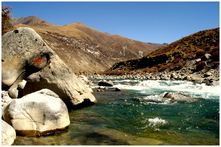"Zum ersten Mal überquerten wir den mäandernden Yarlung Tsangpo River, der als Brahmaputra nach fast 2.900km in den bengalischen Ganges mündet und seine Wasser zum gewaltigen Gangesdelta führt."