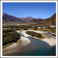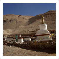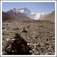 Ich schlichtete einen kleinen Steinhaufen neben die vielen anderen, dachte an die vielen Schicksale am Berg und ging zurück zum Jeep. Es waren unsere letzten Stunden auf dem Dach der Welt. Im Kloster Rongpu, dem mit 5.100 Metern höchstgelegenen und von einigen Mönchen wieder besiedelten Kloster, schlürften wir eine dünne Nudelsuppe, bevor wir uns wieder auf den Weg machten. Staubig und abenteuerlich war die Piste querfeldein nach Tingri. Abseits der Hauptwege lagen einzelne Siedlungen, deren Gehöfte sich flach und grau an den kargen Boden drückten. Yakfladen lagen zum Trocknen verstreut, einzelne Windräder sorgten für den Strom und überall blitzten Parabolspiegel als Kochstelle in der gleißenden Herbstsonne. Vor Schmutz starrende Kinder sprengten winkend hinter den Lehmhütten hervor und sahen den vorbeirauschenden Jeeps, die sie in eine staubige Wolke hüllten, lange nach. Wir fuhren am tiefen Ra Cha River vorbei, der sich an manchen Stellen einen tiefen Canon gegraben hatte. Pfeifhasen versteckten sich in ihren Erdlöchern und hinter der nächsten Flussbiegung mussten wir vor einer Herde Yaks in die Vollbremsung gehen. Nomaden waren auf dem Weg in ihr Winterquartier. In der Fernfahrerstadt Tingri stießen wir wieder auf den Friendship Highway. Von weitem grüßte der Chomolungma zum letzten Mal, bevor er hinter der nächsten Kurve unseren Blicken entschwand. Vom 5.030 Meter hohen Lalung La Pass wehten die letzten Gebetsfahnen vor der nepalesischen Grenze, danach ging es nur noch bergab. Ich tauschte mit Lobsang die letzten Erkenntnisse über Demokratie und Kommunismus und ließ ihn im Grenzort Zhangmu zurück. Nepal empfing uns heiß und schwül. Doch das ist ein anderer Bericht.