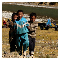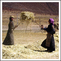 Wir blieben zwei Nächte in Shigatse bevor wir weiter Richtung Shelkar aufbrachen. Der Friendship Highway, Verbindungsstraße zwischen dem nepalesischen Kathmandu und Lhasa, lag hier breit und frisch asphaltiert vor uns. Wir fuhren an kleinen Siedlungen vorbei, zerstörten Klöstern und Ruinen vergangener Schlachten. Am Wegesrand, immer nur eine Haaresbreite von den vorbeirasenden Fahrzeugen entfernt, waren Frauen mit Ausbesserungsarbeiten tätig und boten Bauern ihre Waren feil. Die Feldarbeiten waren in vollem Gange. Yaks zogen Holzpflüge durch den braunen Boden, Getreide gedroschen und Stroh gebündelt. Motorpflüge frischten immer wieder das mittelalterliche anmutende Bild auf.