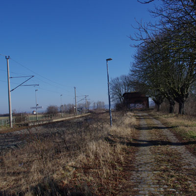 Der Bahnhof liegt etliche Meter am Rand des kleinen Rieddorfes in Sichtweite von Artern. |