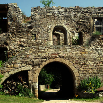 Von dem Wohngebäude auf der nördlichen Flanke existiert heute nur noch ein trauriger Rest. Die ehemalige, überdachte Freitreppe führte damals in den Wohnkomplex.