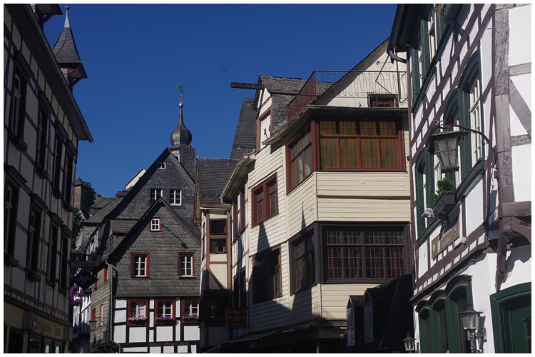 Die typischen schiefergedeckten Fachwerkhäuser der früheren Textilhochburg schmiegen sich eng an die Uferhänge der Rur.