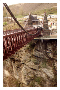 Hinter Gibbston führen zwei Brücken über den Kawarau River. Eine ist für den Verkehr freigegeben, die andere dem Bungee Jumping. Von der 1880 fertiggestellten Brücke stürzte sich etwa 100 Jahre später ein Neuseeländer an einem Hight-Tech-Spezialseil in die Tiefe. Der Sprung in die 43m tiefe Schlucht löste einen weltweiten Boom aus. Seitdem pilgern täglich „Yo Yo Willige“ zur alten Brücke. Als ich über die Brücke laufe, bereitet sich gerade eine Frau auf den Adrenalinkick vor. Der letzte Schritt scheint ihr jedoch trotz freiwilliger Entscheidung nicht leicht zu fallen. Immer wieder zögert sie den Fall in die Tiefe hinaus. Da helfen auch gute Sprüche der anwesenden Freunde nichts. Persönlich kann ich dieser Fallsucht nichts abgewinnen und ich kann die Frau ganz gut verstehen. Nach endlos scheinenden zehn Minuten nimmt sie ihren letzten Mut zusammen. Ein leichter, nicht ganz fairer, Schups eines Helfers überzeugt noch auf seine eigene Weise und der Rest liegt in der Schwerkraft.