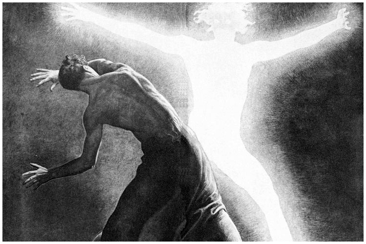 Karl May beauftragte Sascha Schneider mit einem Gemälde in seiner Villa Shatterhand, welche der Künstler 1904 als "Offenbarung" fertigstellte. |