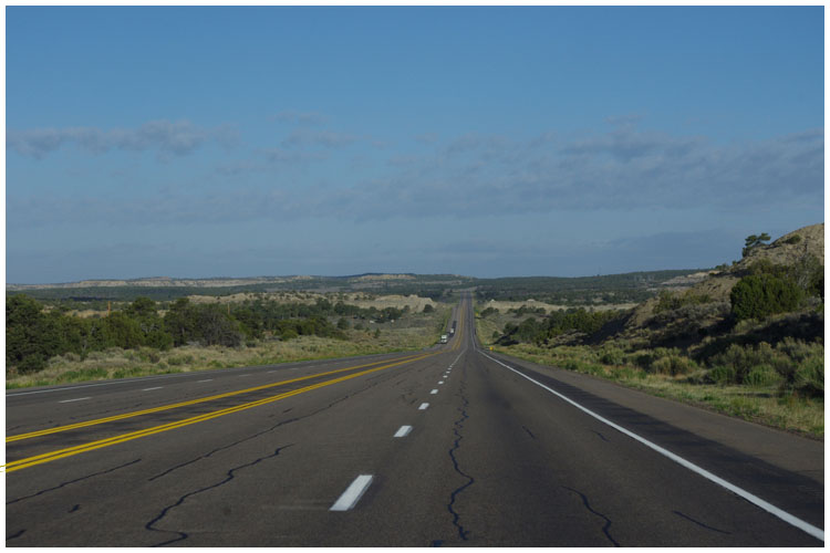 "In den folgenden Tagen fuhr ich über furchtbar lange und einsame Straßen und über teils zerrüttete Schotterpisten. Vereinzelte Blockhütten, Wohntrailer und kleine Ansiedlungen dösten am Wege dahin."