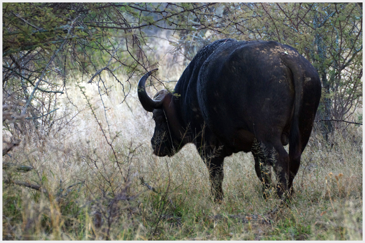 "Ein schwarzer massiger Körper verharrte einen Meter neben dem Pfad, drehte seinen Kopf bedächtig in unsere Richtung und stellte sich als Kaffernbüffel heraus." |