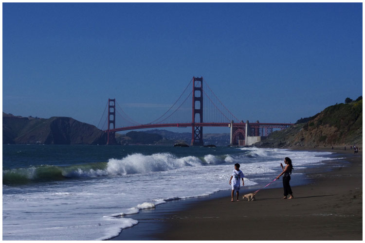 "Etliche Kitesurfer nutzen den Wind direkt unterhalb der Golden Gate Bridge, Möwen ließen sich vom Wind treiben und hofften von den zahlreichen Krabbenfischern ein Dessert zu erhaschen."